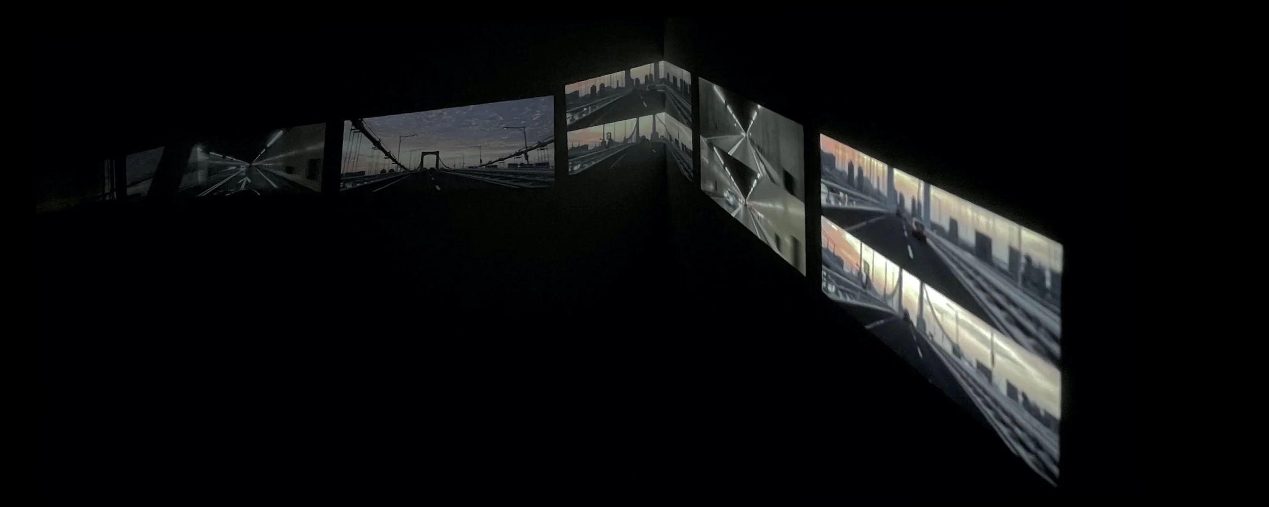 The video work is based on the observation of a visually inclusive relationship between artificial landscape (tunnel/bridge) and nature landscape (mountain/river). It was simultaneously projected on three walls to visualize a heterogeneity of time and space.