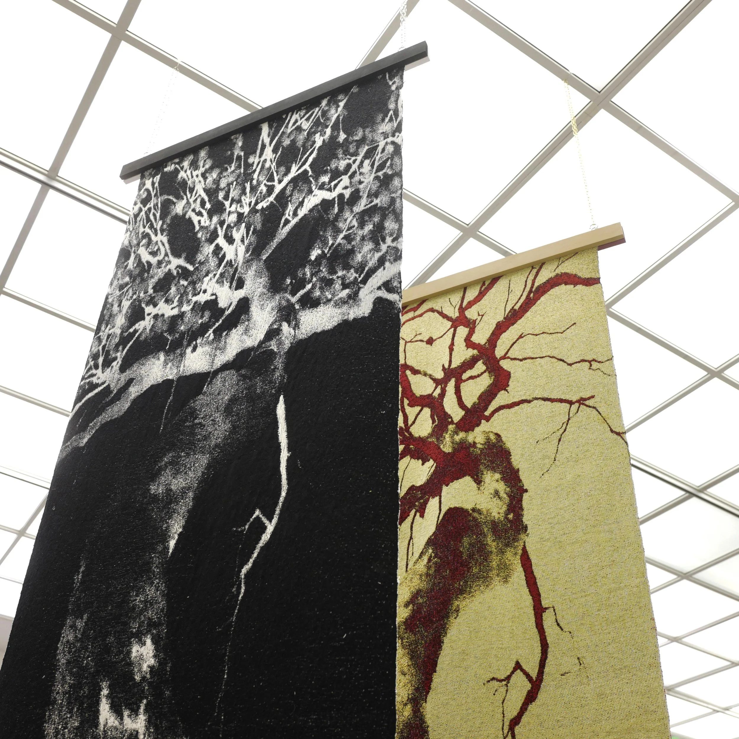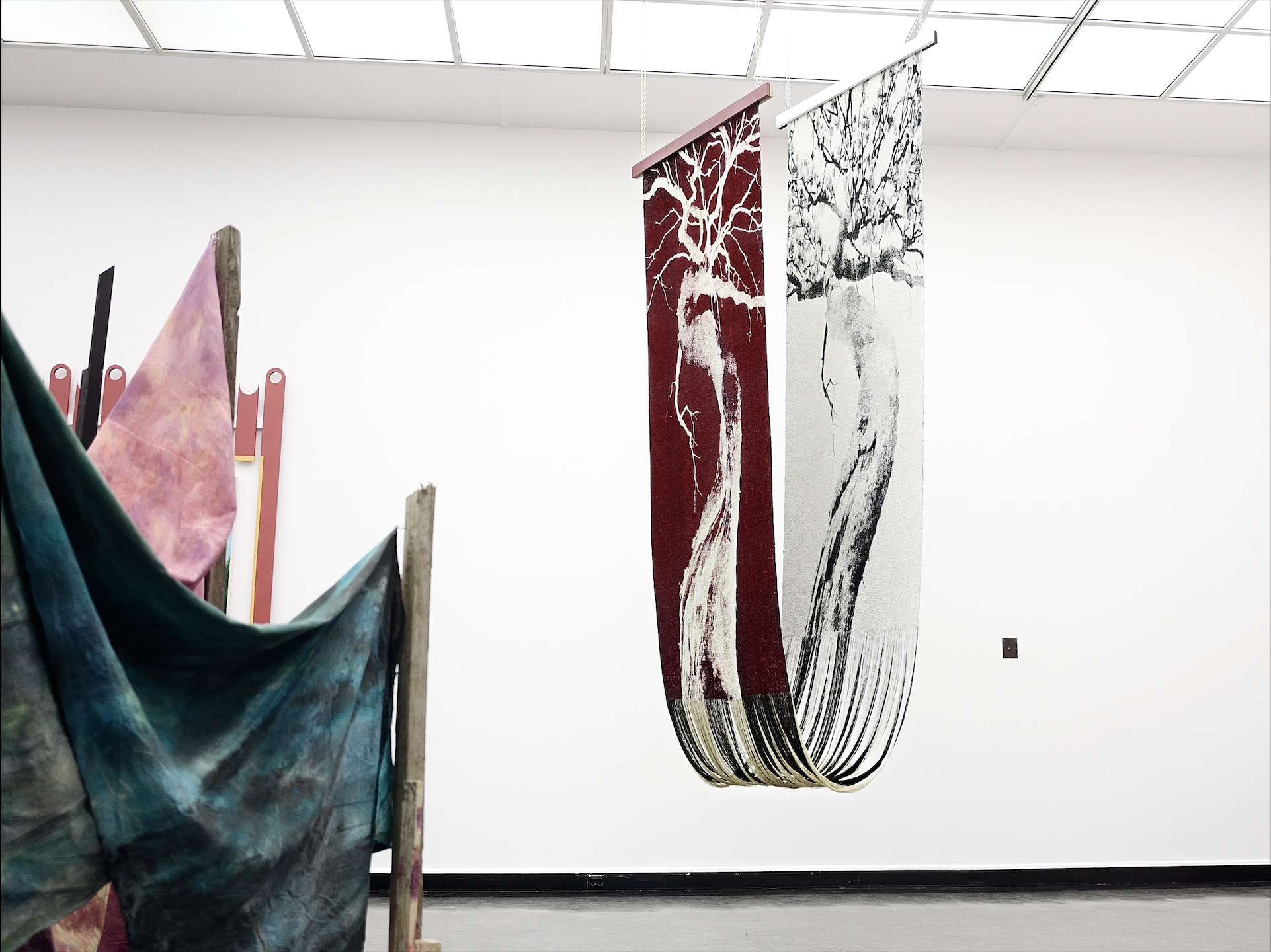 H340 x L105 x W100 cm, wool and chenille, wood, metal chain, digital hand weaving, Bergen Kunsthall, Norway